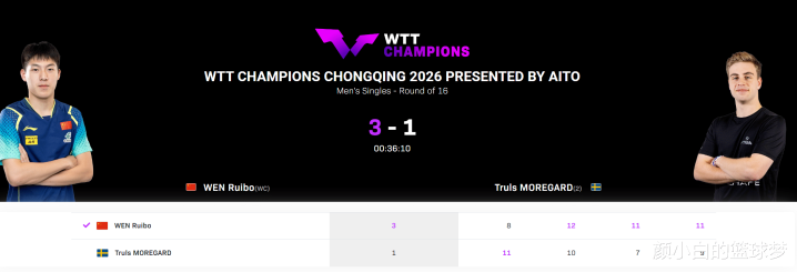 北京时间3月12日,WTT重庆冠军赛男单1/8决赛,温瑞博3-1击败莫雷加德晋级八强,四局比分:【8-11,12-10,11-7,11-9】。这场比赛温瑞博在大比分0-1落后的情况下连赢三局,这场比赛的爆冷程度跟大藤沙月爆冷王曼昱那场一模一样。